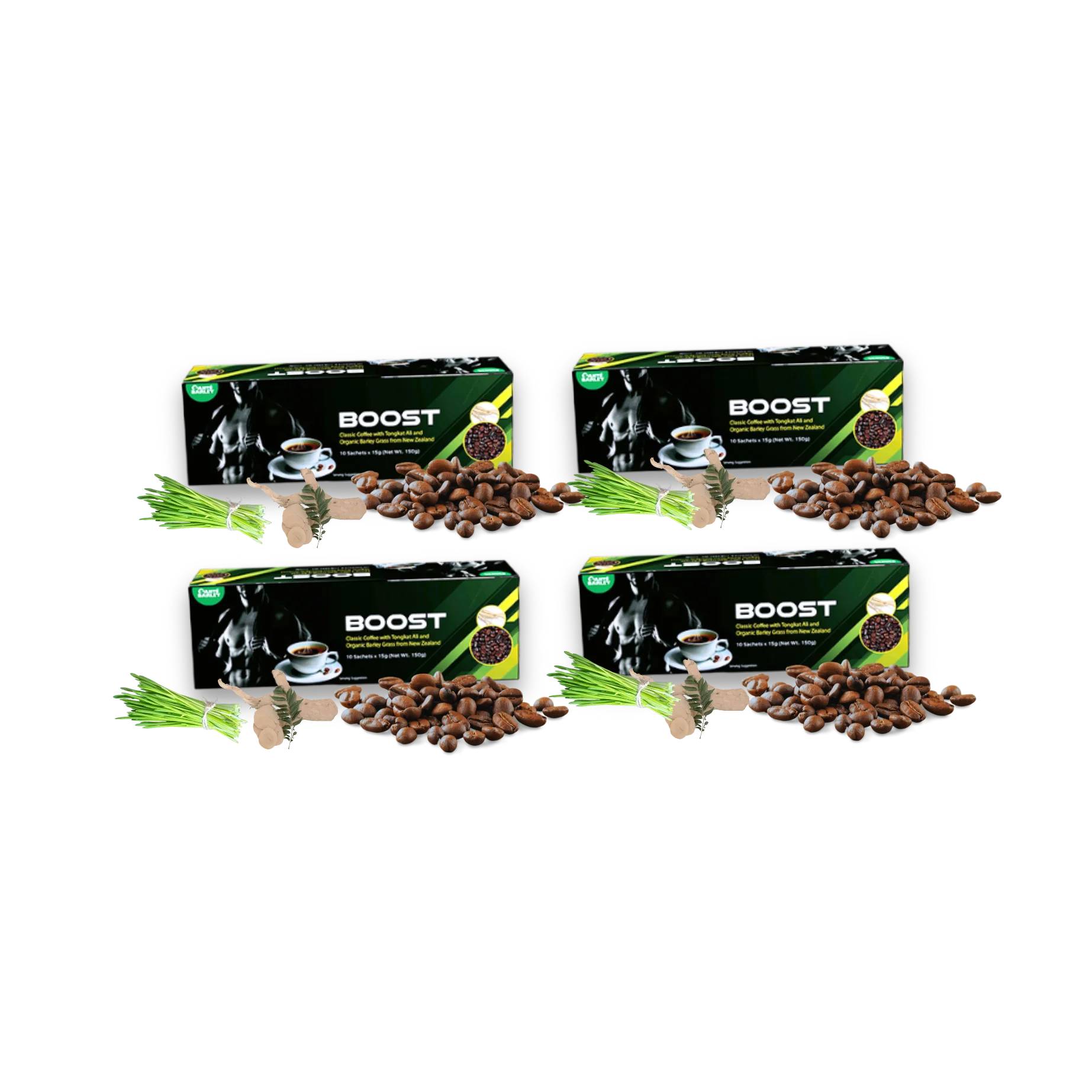 - Total of Four (4) Boxes 15 grams x 10 sachets (Robusta Coffee with Tongkat Ali & Barley)